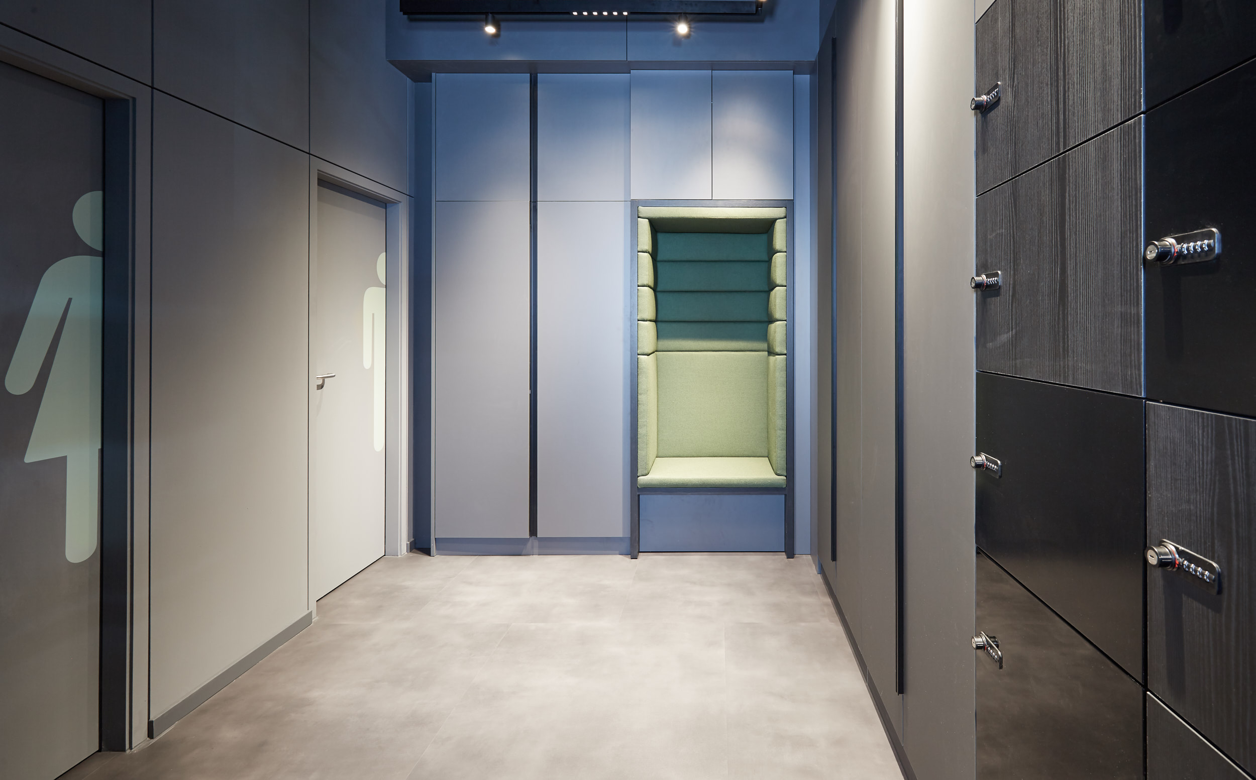 Ein wichtiges Element in einem Coworking Space sind Lockerschränke sowie Stauraum und Garderoben. STATTURA setzte hier auf klassische Zahlenschlösser, um auf die wechselnden Besucherinnen und Besucher zu reagieren. Um Interessierten die verschiedenen Materialien aufzuzeigen, wurden die Spinde in verschiedenen Oberflächen und Lackglanzstufen gefertigt und eingebaut. Direkt daneben befindet sich ein klassischer Einbauschrank inklusive innenliegender beleuchteter Schubkästen sowie eine Garderobe mit Edelstahlstange und eingelassenem LED-Profil. Hier sticht vor allem der flächenbündige Glaseinsatz heraus, der das Hineinschauen ermöglicht. Ein wichtiges Element in einem Coworking Space sind Lockerschränke sowie Stauraum und Garderoben. STATTURA setzte hier auf klassische Zahlenschlösser, um auf die wechselnden Besucherinnen und Besucher zu reagieren. Um Interessierten die verschiedenen Materialien aufzuzeigen, wurden die Spinde in verschiedenen Oberflächen und Lackglanzstufen gefertigt und eingebaut. Direkt daneben befindet sich ein klassischer Einbauschrank inklusive innenliegender beleuchteter Schubkästen sowie eine Garderobe mit Edelstahlstange und eingelassenem LED-Profil. Hier sticht vor allem der flächenbündige Glaseinsatz heraus, der das Hineinschauen ermöglicht.