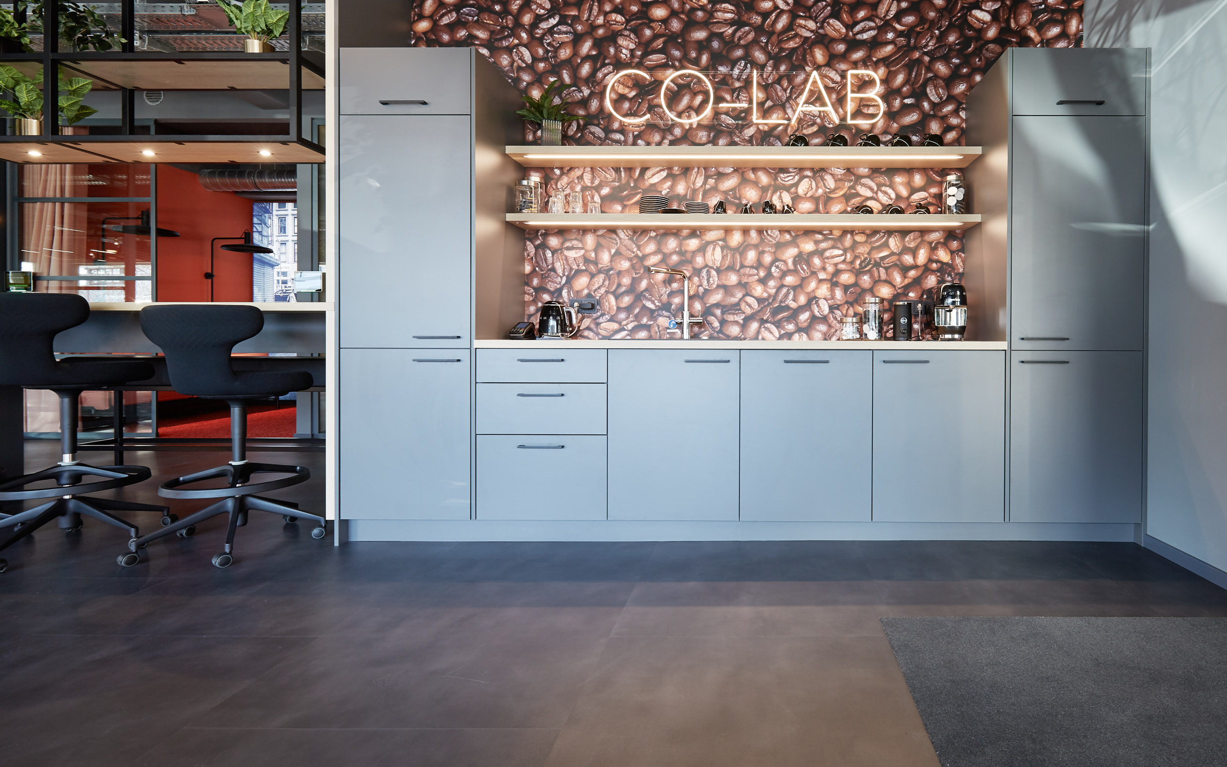 Ein absolutes Highlight ist der Coffeepoint im Eingangsbereich, der sämtliche Funktionen einer klassischen Office-Küche abdeckt. Dieser lädt die Besucherinnen und Besucher zum unbeschwerten Austauschen ein, ermöglicht entspannte Pausen zwischen der Arbeit und dient während Workshops oder Events als Austauschzone. Durch die starke Nutzung war es dem Kunden wichtig, hier die Funktionalität mit dem Design zu verbinden. Es wurde darauf geachtet, kratzunempfindliche Oberflächen, schlichte Griffe und eine generell effizientere Ausführung der Konstruktion zu verwenden. Der Spritzschutz in Kaffeebohnen-Optik wurde direkt per Digitaldruck auf eine Platte gedruckt, somit ist keine Folie ,die aufwendig darauf geklebt werden muss, nötig. Das Motiv kann natürlich individuell angepasst werden.