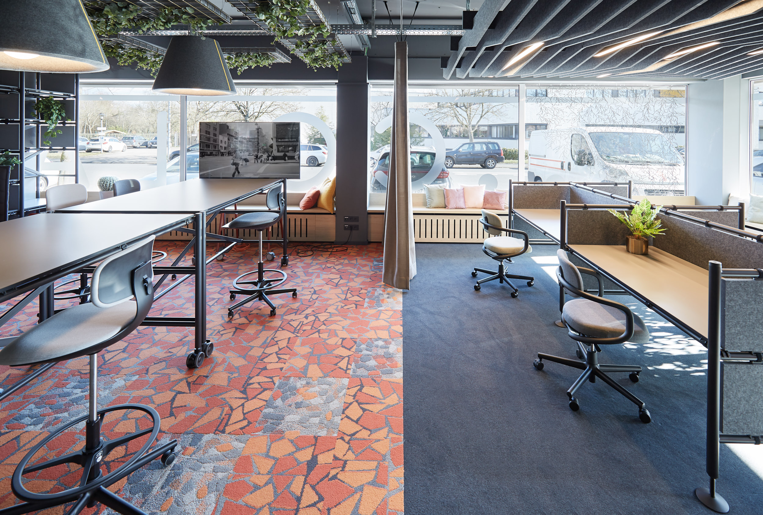 Ein weiteres Highlight ist die Highbench neben dem Coffeepoint. Sie verbindet den Eingangs-/Pausenbereich perfekt mit dem Arbeitsbereich. So wird sie auch genutzt, ob entspannt mit Laptop arbeiten, als Ort für die Mittagspause oder für einen Austausch mit einer Kollegin oder Kollegen erfüllt die Highbench alle diese Zwecke.Der von der Decke hängende Pflanzenkasten fügt sich der ästhetischen Form der Lamellenwand und des verbunden Tisches perfekt ein und gibt dem Raum ein sehr natürliches Klima. Die Holzelemente inklusive Regal mit Einlegeböden und LED Beleuchtung wurden individuell gefertigt und montiert.